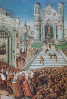 การกลับมาสู่เมืองทรอยของเจ้าชายปารีสก็สมตามที่โหราจารย์พยากรณ์เอาไว้ แต่ไม่มีใครกล้าทักติง เพราะเจ้าเมืองทรอยที่ชื่อว่าพระเจ้าพรีอัม Priam นั้นกำลังชื่นชมหลงใหลความเป็นฮีโร่ของเจ้าชายที่เพิ่งกลับมาพร้อมทั้งนางงามที่สวยที่สุดในโลก และหารู้ไม่ว่านี่คือความหายนะที่เจ้าชายปารีสกำลังนำมาสู่เมืองทรอย เมื่อพระเจ้ามินิเลากลับมาจากธุระ แล้วพบว่าเมียหนีตามชู้ไปก็เป็นอันโกรธาเป็นหนักหนา เรียกประชุมเจ้าเมืองทั้งหลายที่เคยร่วมสาบานกันไว้ ยกทัพไปจัดการกับเมืองทรอย และไปเอาเมียคืนมา คำสาบานที่ร่วมกันทำนี่ก็แปลกดีเหมือนกัน เพิ่งเคยได้ยินครั้งแรก กล่าวคือนางสาวเฮเลนนั้นเป็นสาวที่สวยที่สุดในแดนดินของเจ้าเมือง ก่อนแต่งงานนั้นมีเจ้าชาย เจ้าเมืองมาเหยียบหัวกระไดหน้าวังจนพังไปหลายขั้น แต่ละคนก็องอาจห้าวหาญทั้งนั้น พ่อของเฮเลนนั้นกลัวพวกนี้จะฆ่าฟันกันเองตายหมดเสียก่อน กว่าจะได้นางสาวเฮเลนไปเป็นนาง คงต้องเสียค่าทำศพมากมาย พ่อตาในอนาคตเลยให้ทุกคนที่มาจีบลูกสาวตัว (นางเฮเลนเป็นแค่ลูกเลี้ยง พ่อที่แท้จริงคือพระเจ้าบนสวรรค์ จูปีเตอร์นั้นเอง แต่ไปแอบปล่อยไข่ไว้บนโลกมนุษย์กับนาง Leda แต่ไม่กล้าเลี้ยงไว้ กลัวเมียหลวง จูโนจะเล่นงาน) คำสาบานนั้นว่า "คนใดคนหนึ่งในพวกสูเจ้าจะได้ครองหัวใจและตัวของนาง แต่เพื่อให้นางจะได้มีชีวิตครอบครัวที่สงบสุข คนที่ไม่ได้ตัวนางไปจะไปรบกวนนางไม่ได้ นอกจากนี้แล้ว ถ้าใครก็ตามที่ไปรบกวนต่อครอบครัวของนาง เจ้าทั้งหมดต้องออกปกป้องครอบครัวนางไว้ โอเคหรือเปล่า ถ้าโอเคก็ทำการสาบานไว้ต่อหน้าพระเจ้าจูปีเตอร์ที่เป็นพ่อที่แท้จริงของนางเสีย เอ้า แต่ละคนเอาดอกไม้ธูปเทียนไปหนึ่งกำ แล้วก็สาบานตามที่ข้า ฯ บอกไว้นี้ ห้ามกลับคำ ถ้าไม่รักษาคำสาบานนี้ ก็ขอให้ตายเจ็ดวัด เก้าวัด อดได้ค่าประกันชีวิต แล้วเนื้อยังจะให้หมาแทะ เหลือแต่กระดูกให้หนอนกิน" แล้วนางก็เลือกเอาพระเจ้า มินิเล่าแห่งเมืองสปาต้าเป็นพระสวามี ด้วยคำสาบานนี้ทุกคนก็คงรักษาไว้อย่างมั่นคง ไม่ไปรบกวนครอบครัวนี้จริง ๆ เมื่อนางหนีตามชู้ไป แต่พระเจ้ามินิเลาเขายืนยันว่าถูกเจ้าชายปารีสลักขโมยตัวไป ตามคำพูดของยายแป้น แม่คนใช้ประจำตัวนางเฮเลนที่ไปแอบดูเขาคืนนั้น ยายแป้นที่เป็นคนช่างพูด ก็บรรยายเสียละเอียด แม้กระทั่งเรื่องบนเตียง ให้พระเจ้ามินิเลาฟังจนเดือดดาล หนวดคราวตั้งชี้ขึ้นฟ้า “แหม ๆ ไอ้ปารีสชั่วนี่ กูจะต้องยกทัพไปเผาเมืองทรอยให้มันวอดวาย จะตายให้เขาลือชัย ว่าเมียกูชื่อเฮเลน” เขาคงร่ายรำกั