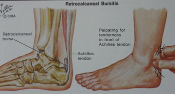 ถ้าเกิดเจ็บที่หุ้มส้นเท้า อาจจากการถูของหุ้มข้อเท้าโดนที่เส้นเอ็นร้อยหวาย Achilles tendon นอกนี้ด้านใต้และในของเอ็นนี้มีถุงน้ำด้วย อาจเกิด bursitis เรียกว่า Pump bump ทำให้ถุงน้ำบวม มันบวมแถวเอ็นร้อยหวายไปเกาะที่กระดูกส้นเท้า ยิ่งเดินยิ่งเจ็บมากขึ้น หาหมอซิครับ เพราะมันบวม อาจต้องเปลี่ยนรองเท้าก็ได้ (รูปที่เห็นเจ็บหลังส้นเท้า)