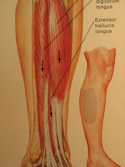 เจ็บหน้าแข้ง compartment syndrome การเจ็บปวดนี่อาจจะเกิดมานาน แล้วค่อย ๆ เพิ่มความเจ็บมากขึ้น "หมอครับ ช่วยดูหน่อย หนูทนไม่ไหวแล้ว" (อย่าคิดมาก นักวิ่งผู้หญิงนะ เขาเจ็บขาเท่านั้น) คนไข้จะชี้บอกที่เจ็บอยู่แถวรอบ ๆ หน้าแข้ง กดที่ไหนก็เจ็บที่นั่น มันเกิดจากการชอกช้ำของกล้ามเนื้อที่ยกหน้าเท้าขึ้น Dorsum of foot คือตอนหลังจากถีบเท้าออก แล้วต้องยกขาแล้วเท้าลอยจากพื้น จนถึงก่อนเท้าแตะพื้น คือฝ่าเท้าจะต้องให้ลอยจากพื้นให้ได้ ไม่งั้นเท้าจะสะดุดพื้นหกล้มทันที (ดูรูปการวิ่งในฉบับที่แล้ว อ้าว! ทิ้งขยะไปแล้ว) อยากรู้ว่ากล้ามเนื้อชื่ออะไร จะบอกให้ก็ได้ คือ Anterior tibialis muscles, Extensor digitorum longus และ Extensor halucis longus พวกนี้มันอยู่แถวหน้าแข้ง ระหว่างกระดูกสองชิ้นของหน้าแข้ง บอกแล้วไง อย่าไปรู้ชื่อพวกมันเลย ปวดหัวเปล่า ๆ